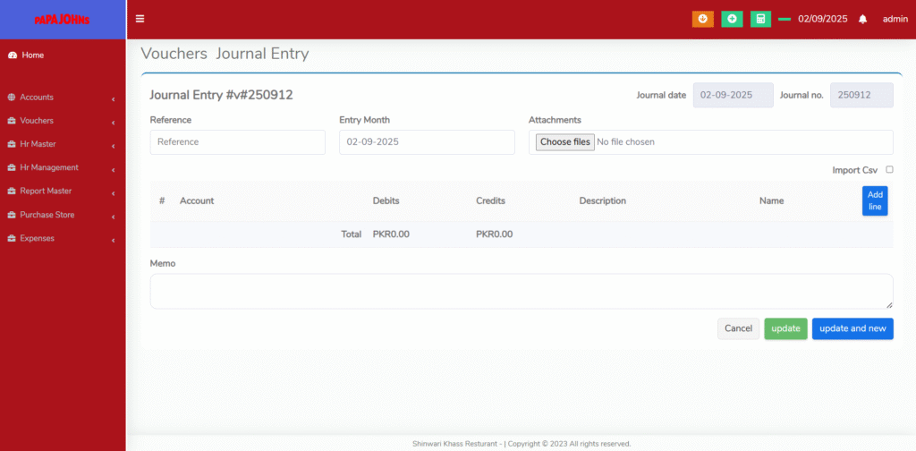 A secure accounting module for managing journal vouchers, debit-credit entries, and financial adjustments with document uploads, automatic balance validation, audit trails, and streamlined bookkeeping workflows.
